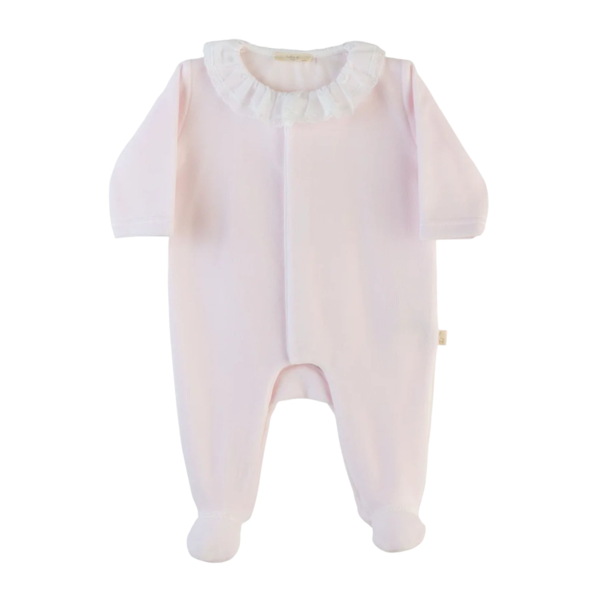 Baby Gi pink cotton babygrow and jacket 2pc set with popper fastenings for ease. Completed with decorative white lace frill collar on the babygrow.