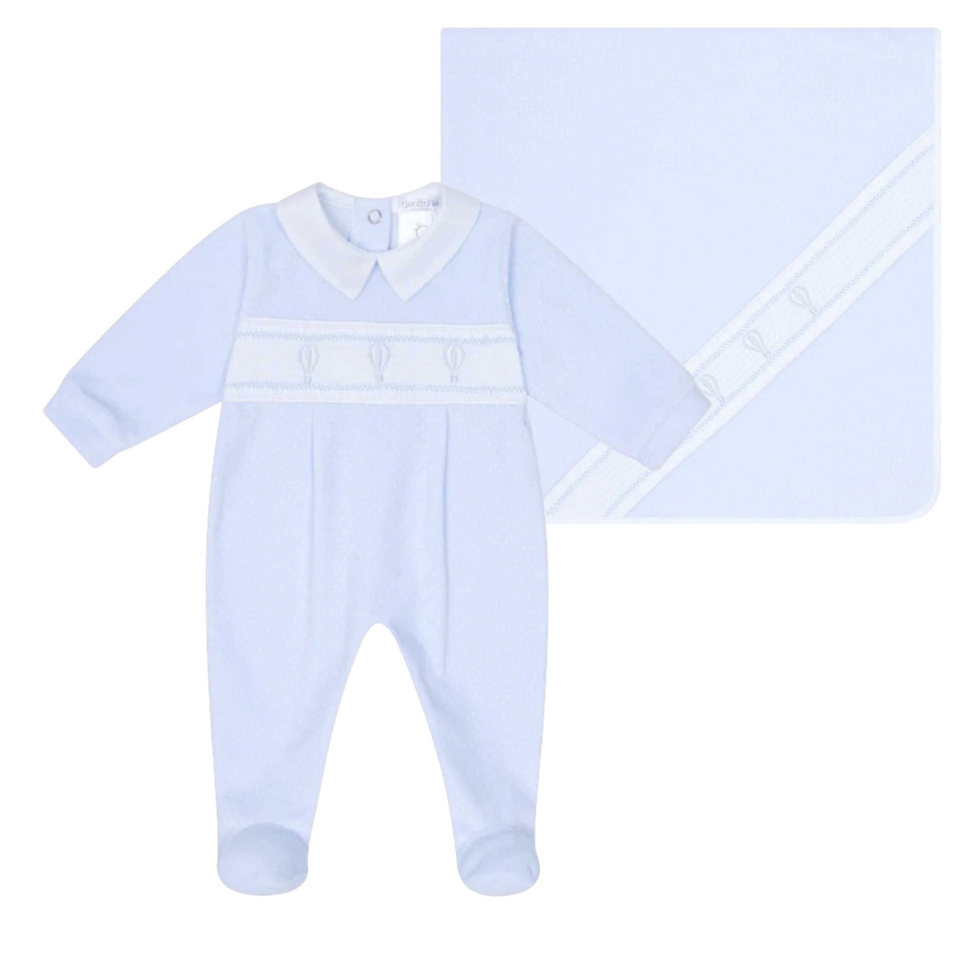 Deolinda, Autumn/Winter 2025 collection. Pale blue velour babygrow with white polka dot decoration. Completed with white smocked panel and hot air balloon embroidered detailing. Paired with matching blanket.