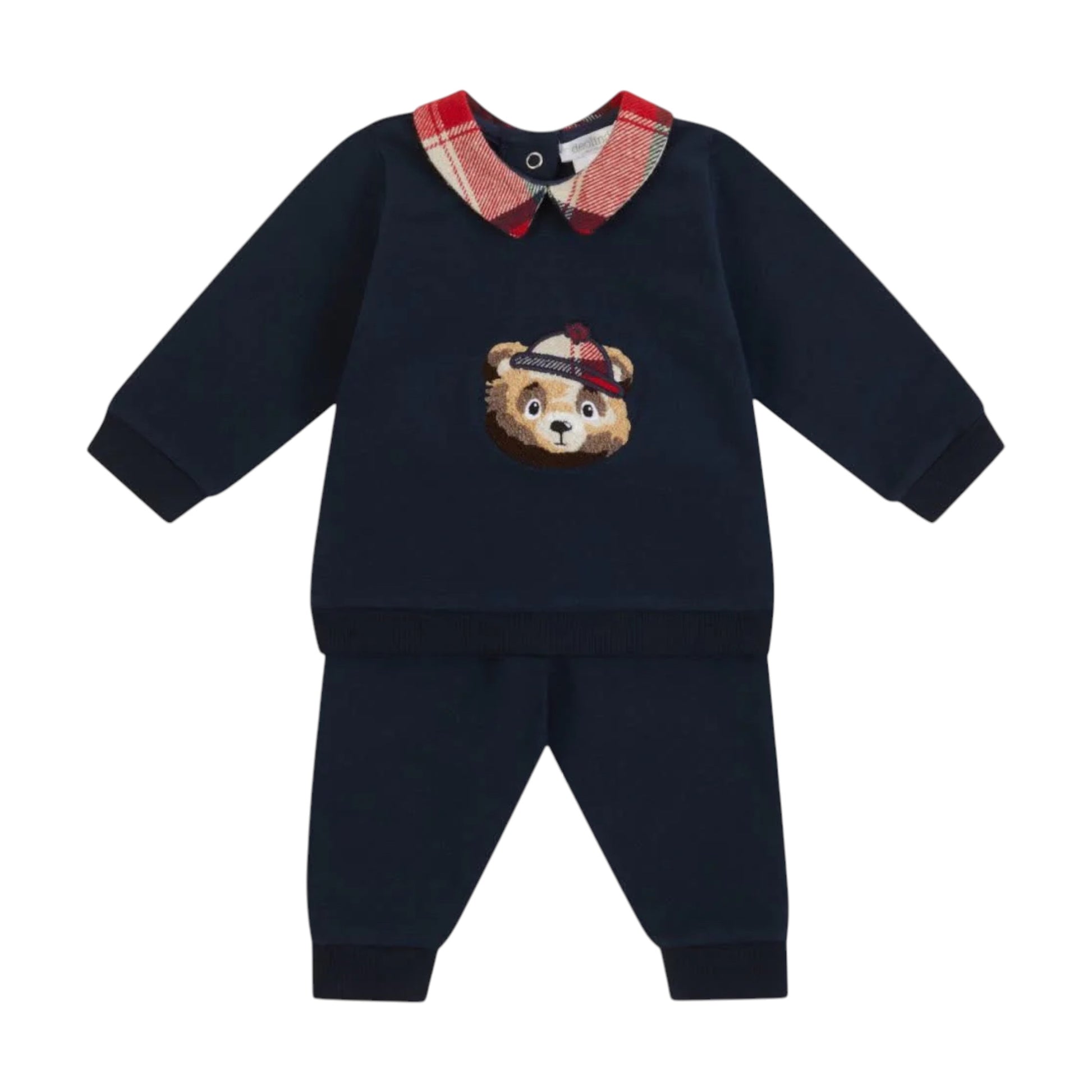 Deolinda Autumn/Winter 2025 collection. 2pc navy tracksuit with red tartan accents on the collar and elbows. Completed with teddy decoration in the centre of the jumper.