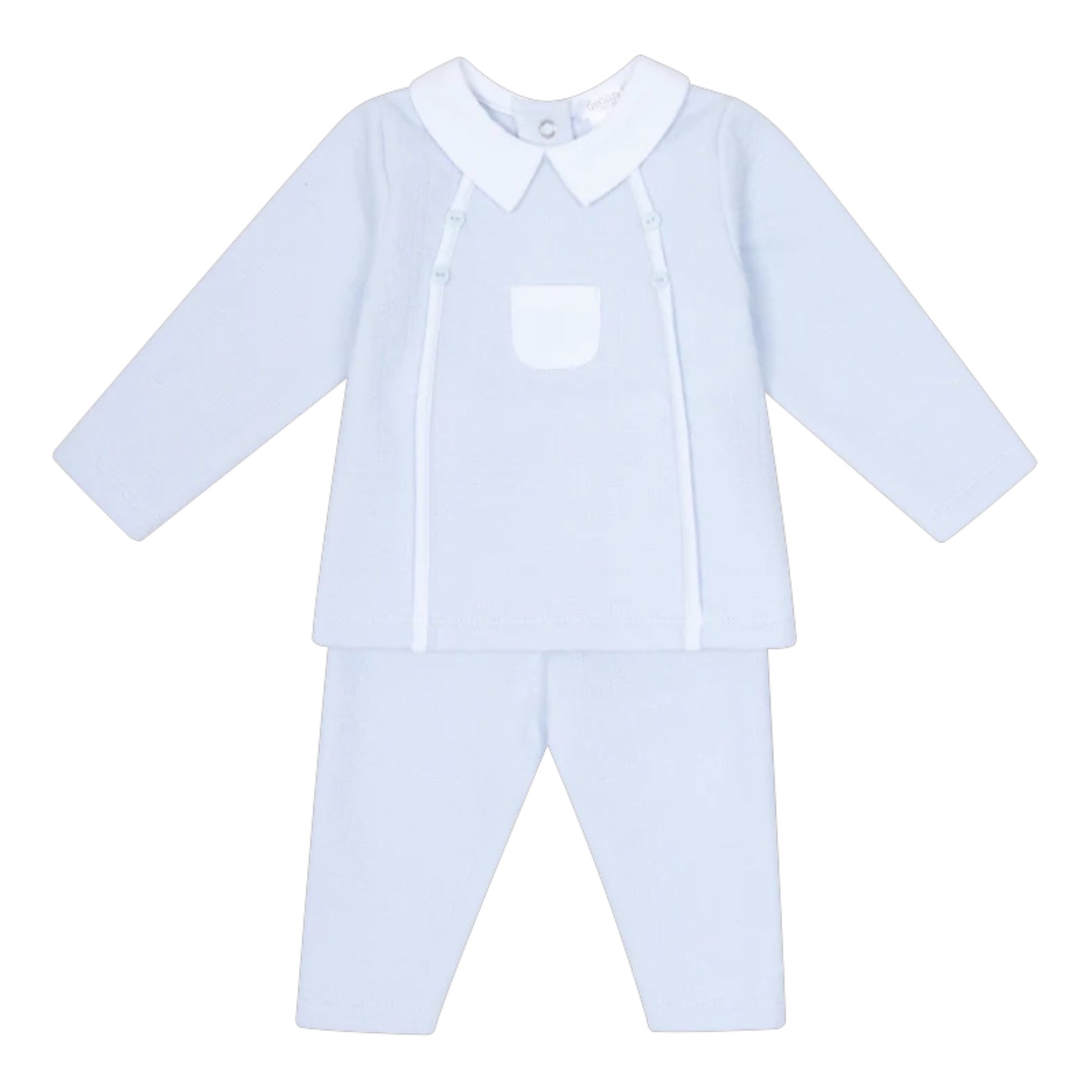 Deolinda, Autumn/Winter 2025 collection. 2pc sky blue textured, quilted tracksuit. Long sleeve top with Peter Pan collar and white piping detail. Paired with elasticated matching pants.