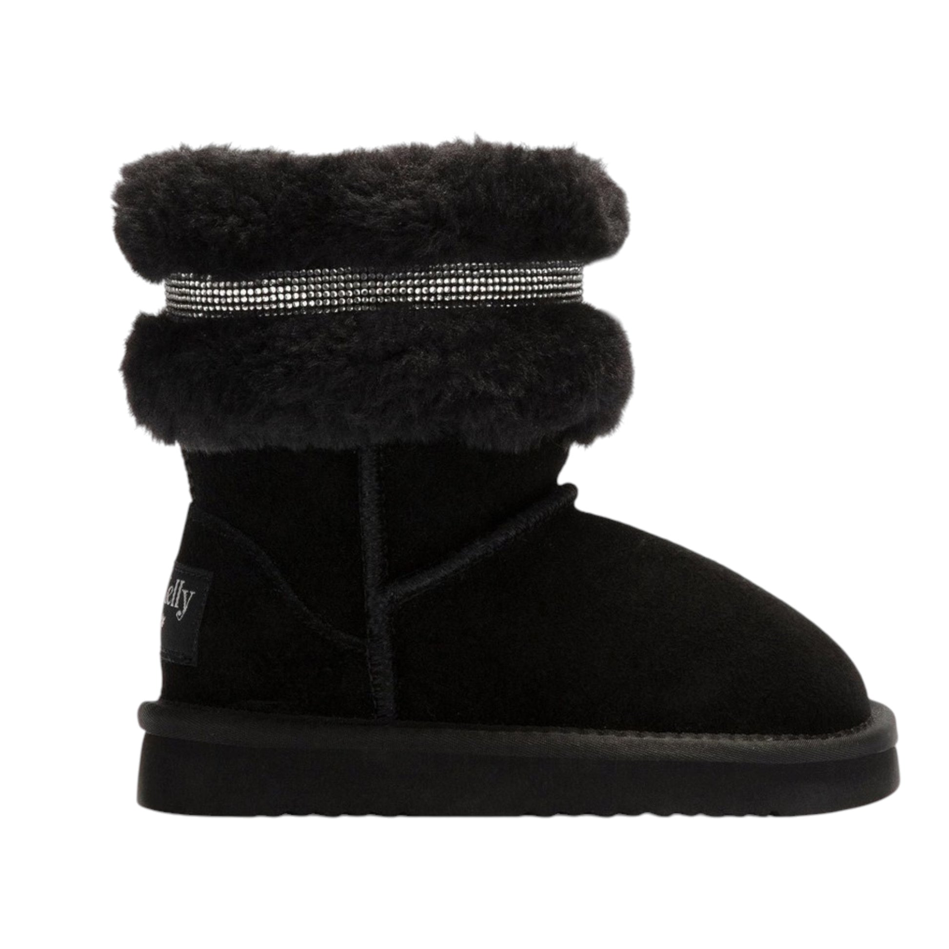 Lelli Kelly Michelle black suede boots. Completed with faux fur lining and trim around the top. As well as decorative diamanté band.
