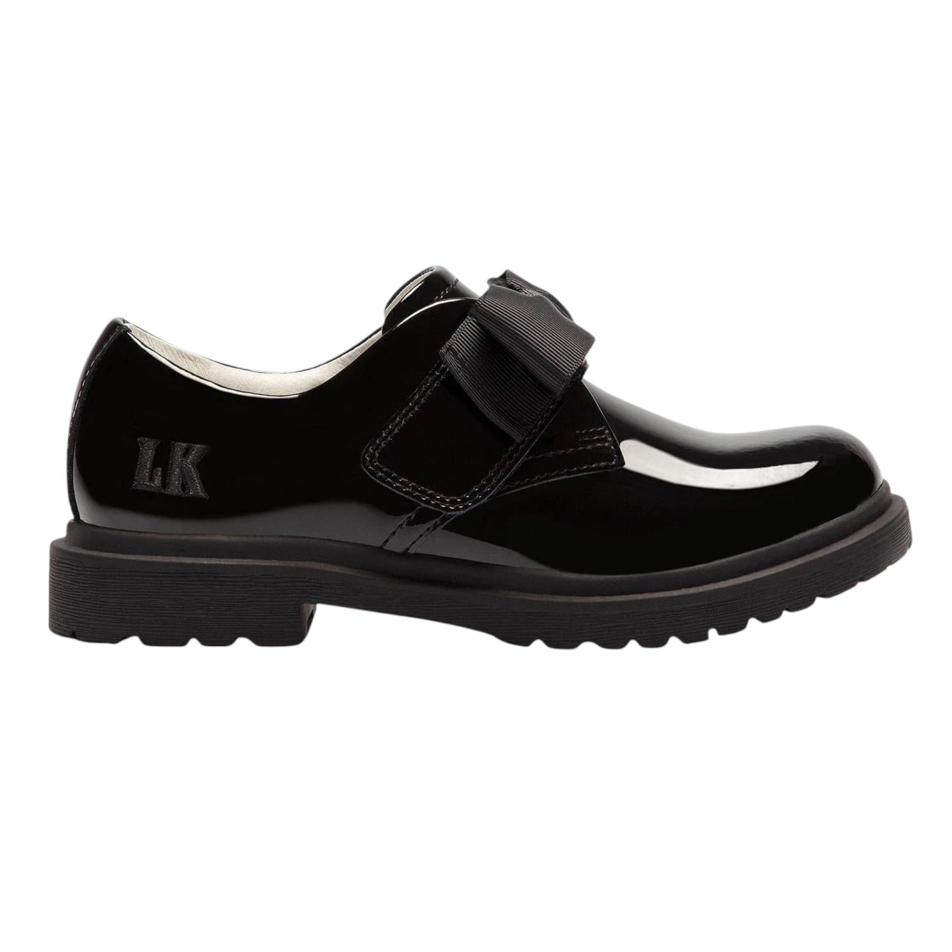 Lelli Kelly Miss LK Faye school shoes. Black patent leather school shoe with fabric ow decoration. Velcro strap fastening for ease.