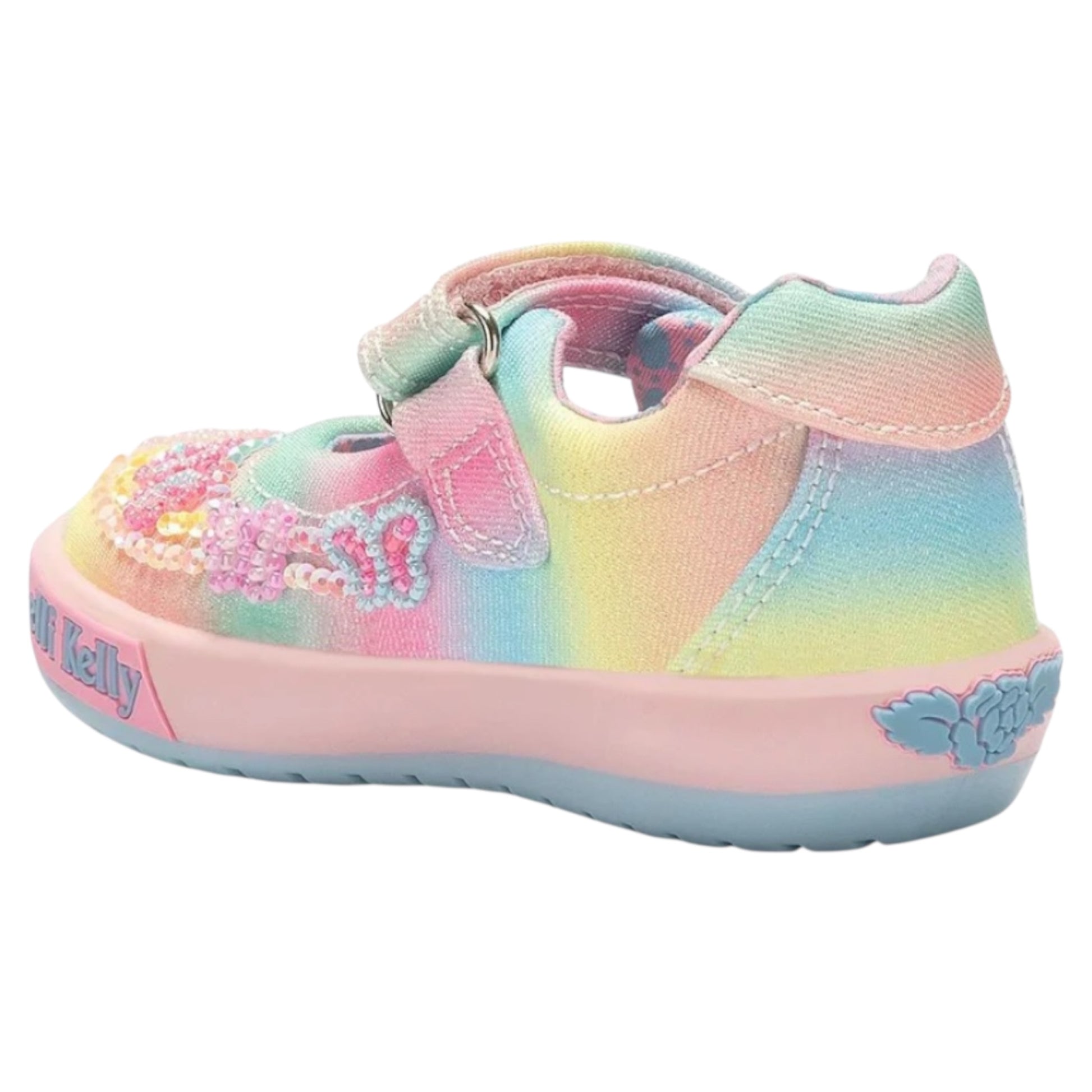 Lelli Kelly Myla, pastel coloured dolly shoes. Completed with butterfly beaded decorations, aswell as a Velcro strap fastening for ease.