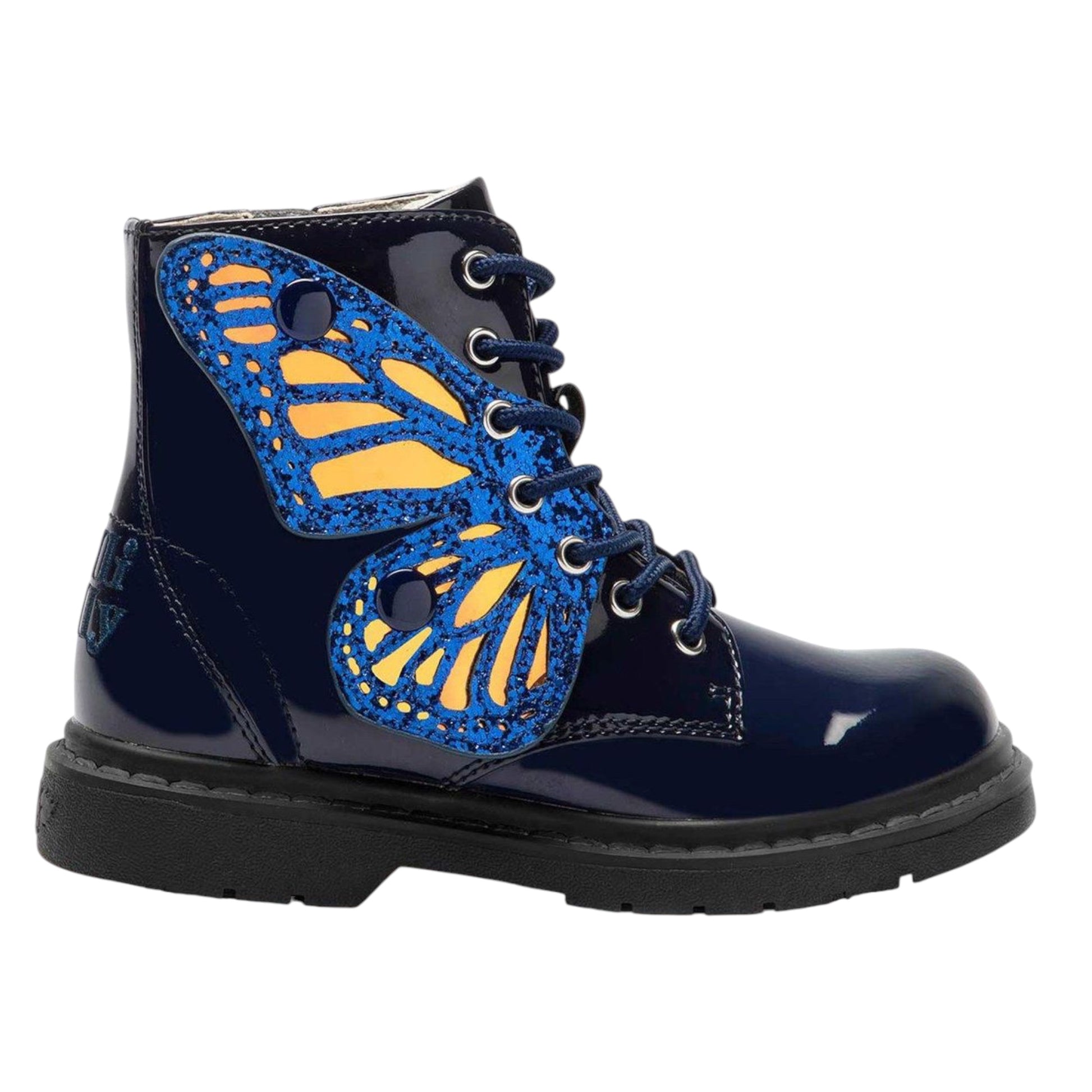 Lelli Kelly navy patent butterfly wing boots. Completed with side zipper and lace up fastenings for ease.