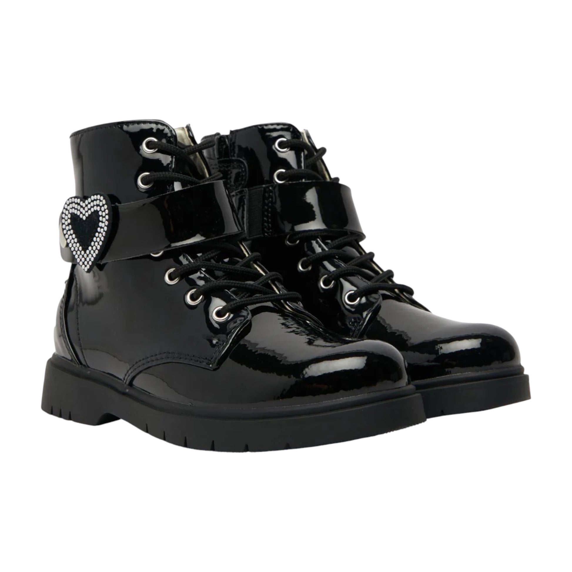 Lelli Kelly Stella Stellina black patent boots. Diamante heart decorative strap. Completed with side zip and lace up fastenings.