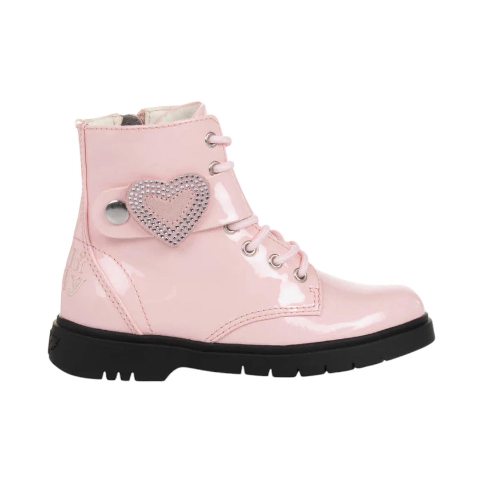 Lelli Kelly Stella Stellina pale pink patent boots. Diamante heart strap decoration. Completed with side zip and lace up fastening.