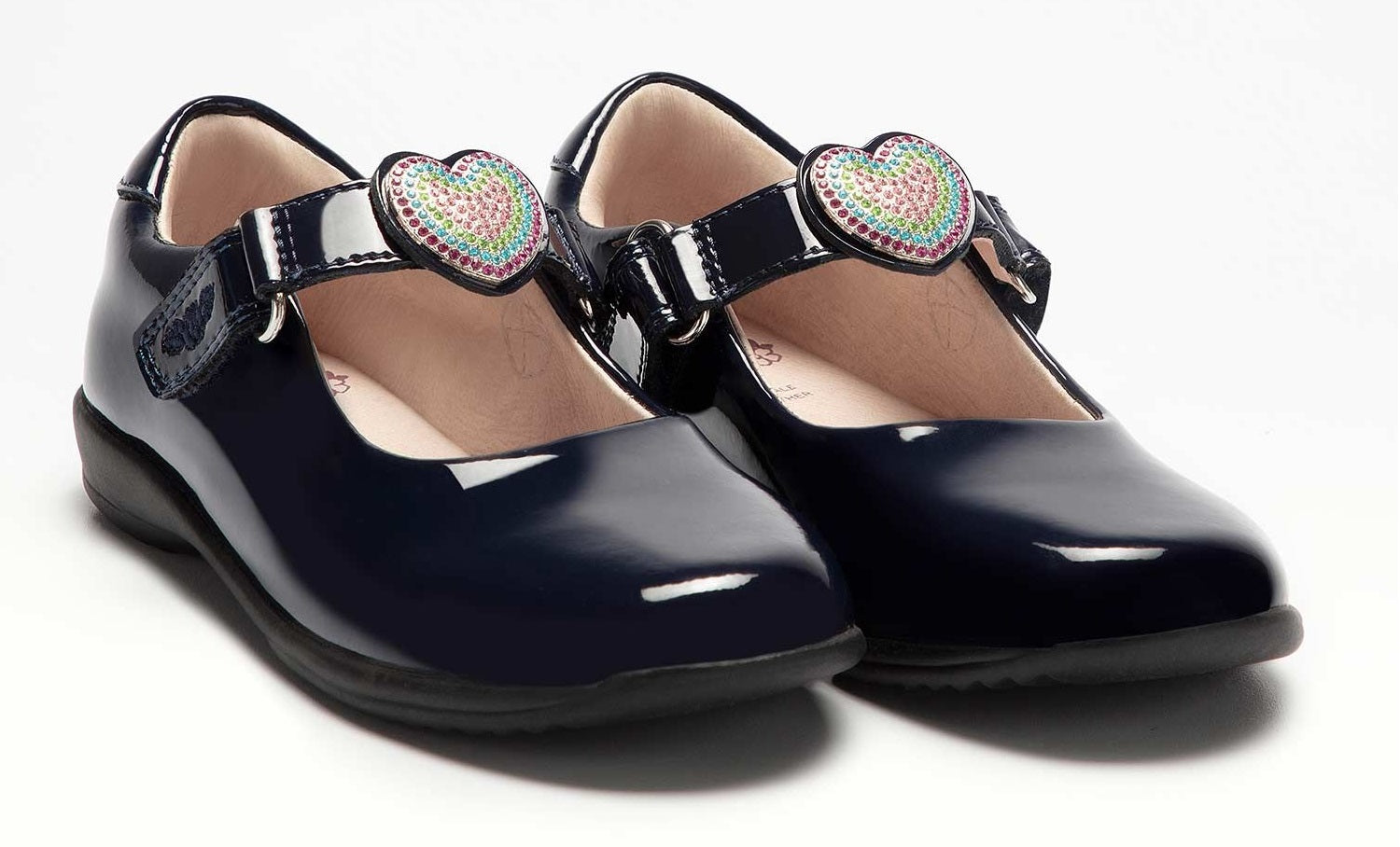 Lelli Kelly Valentina black patent leather school shoes. Interchangeable velcro strap design with diamanté heart decoration, as well as black patent bow and embroidered Lelli Kelly strap.