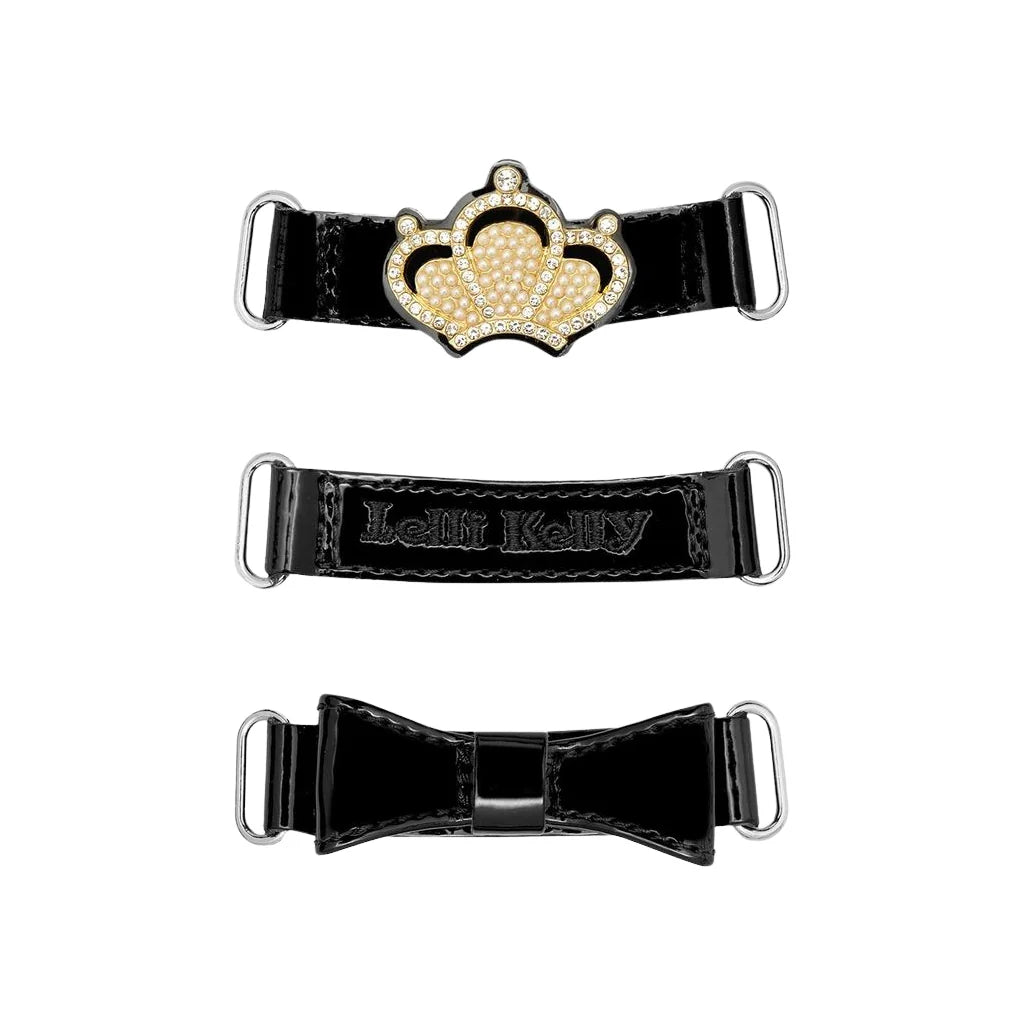 Lelli Kelly Victoria black patent leather school shoes. Trendy chunky soles with velcro strap fastenings. Interchangeable stop design with decorative diamanté crown, black patent bows and embroidered Lelli Kelly straps too.
