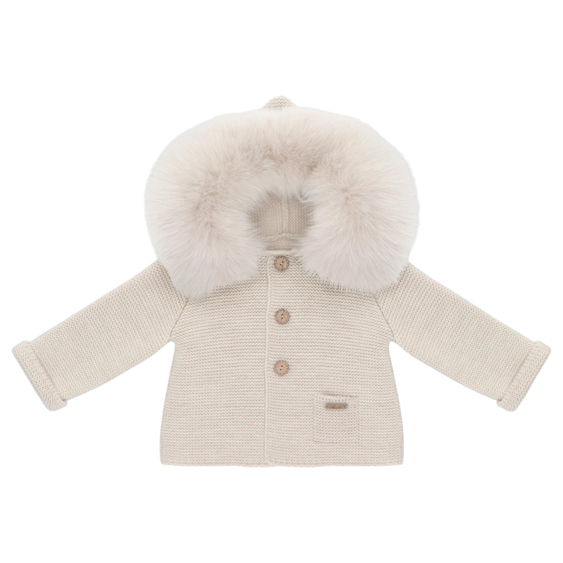 Martin Aranda Autumn/Winter 2025 collection. Beige cable knit coat with wooden button fastening. Completed with detachable, natural fur trim detailing on the hood.