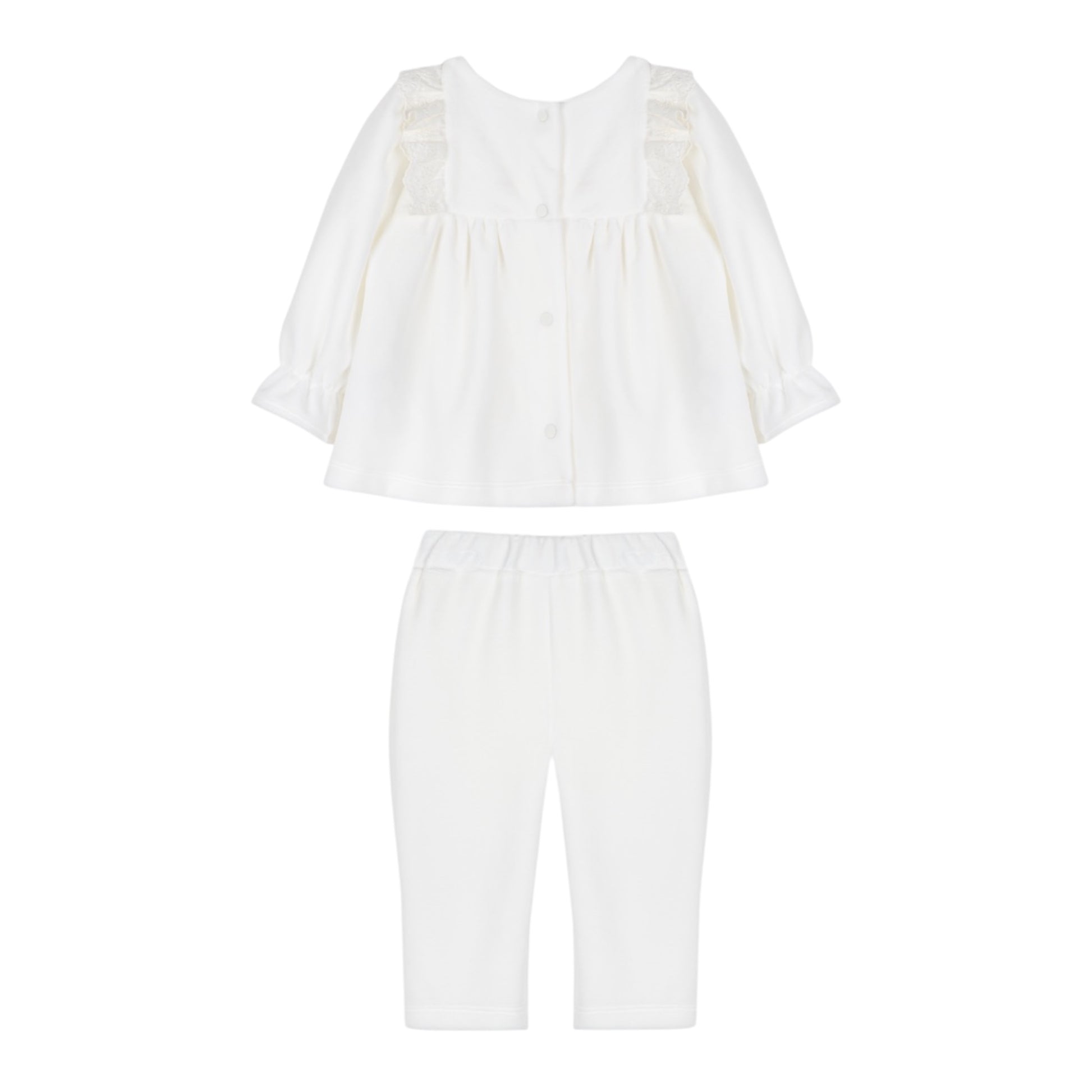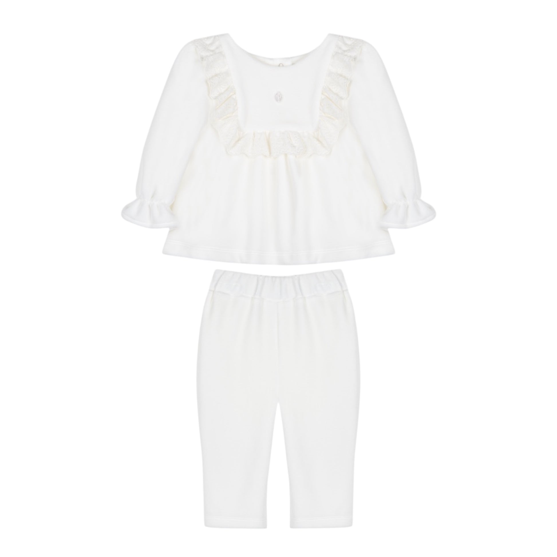 Patachou, Autumn/Winter 2025 collection. Winter white velour 2pc set. Long sleeve top with ruffle trim, paired with matching pants.