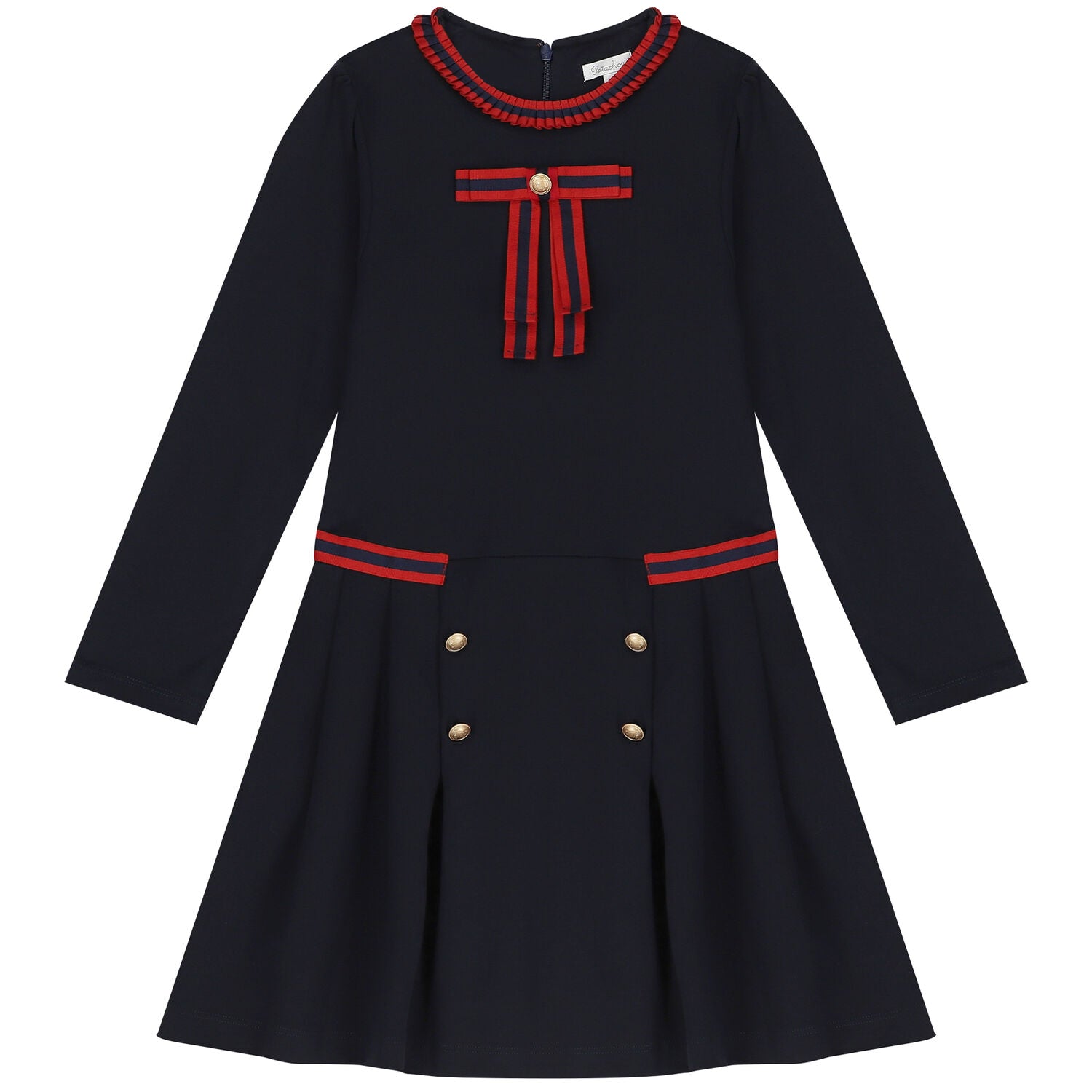 Patachou, French navy pleated dress, perfect for Autumn/Winter. Completed with red ruffle trim detailing and a decorative bow, giving that luxury feel. As well as gold button decorations too.