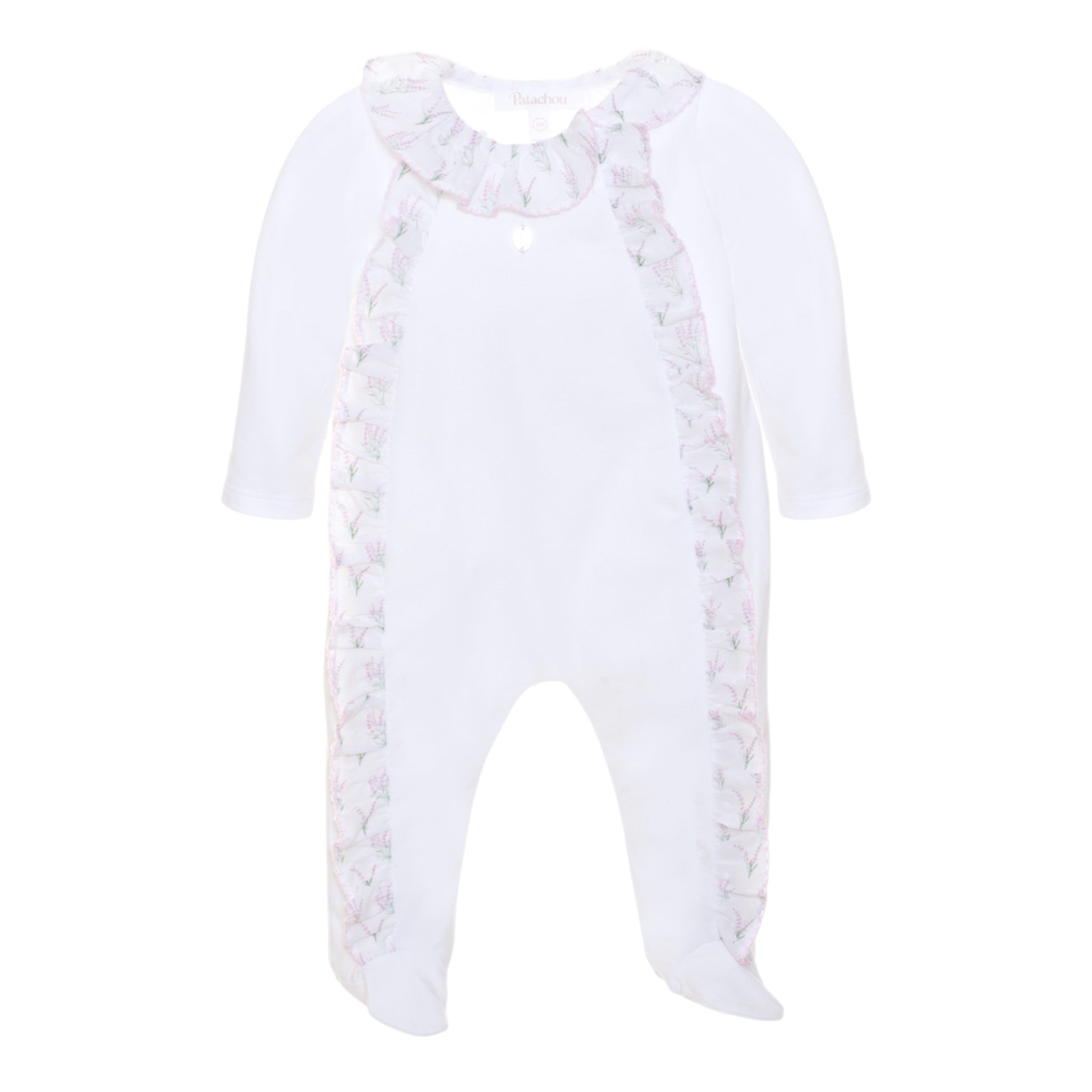Patachou white cotton babygrow with lavender print ruffle decoration. Completed with popper fastening for ease.