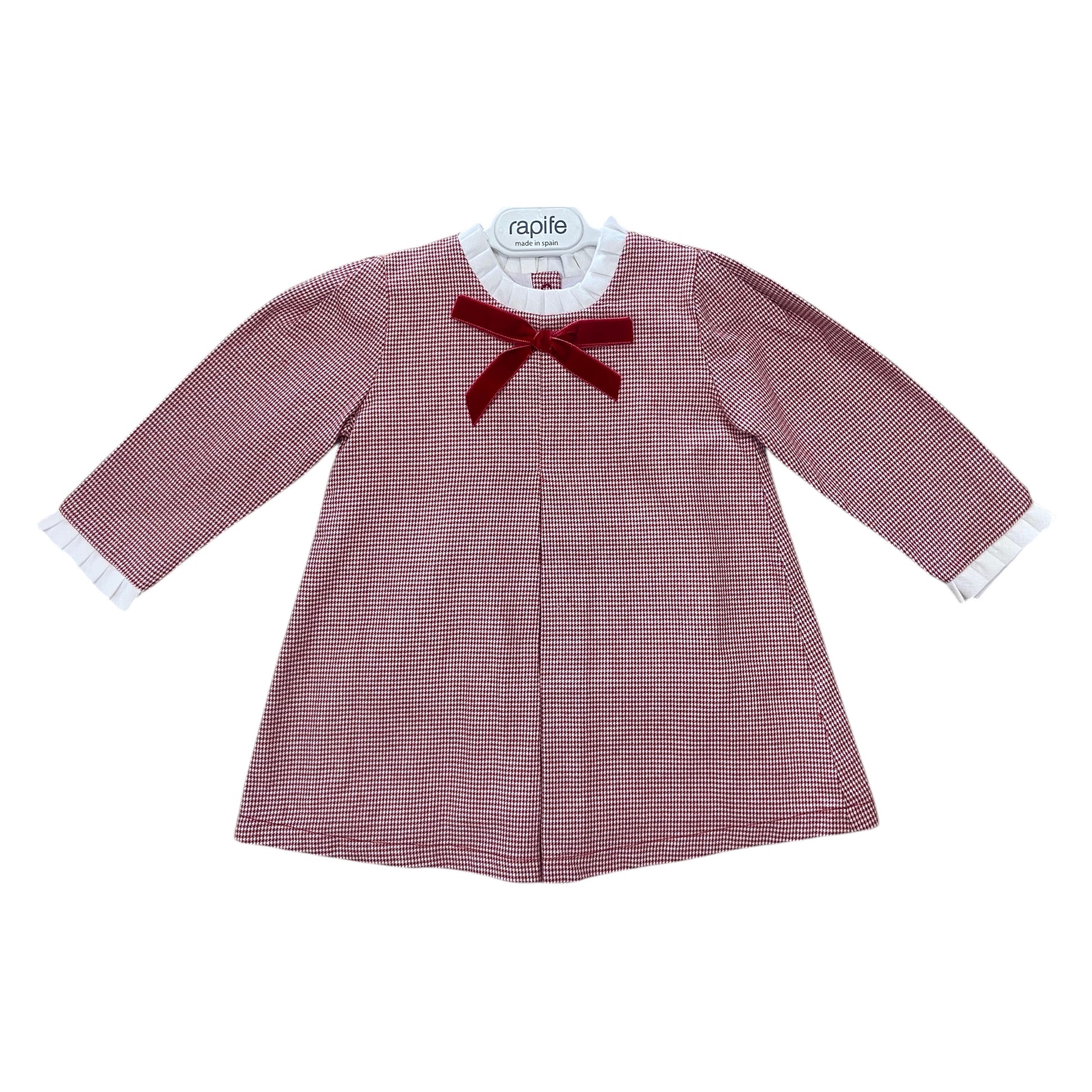 Rapife Autumn/Winter 2025 collection. Red and white dog tooth check dress with red velvet bow decoration. Completed with white pleated collar and white sleeve cuffs.